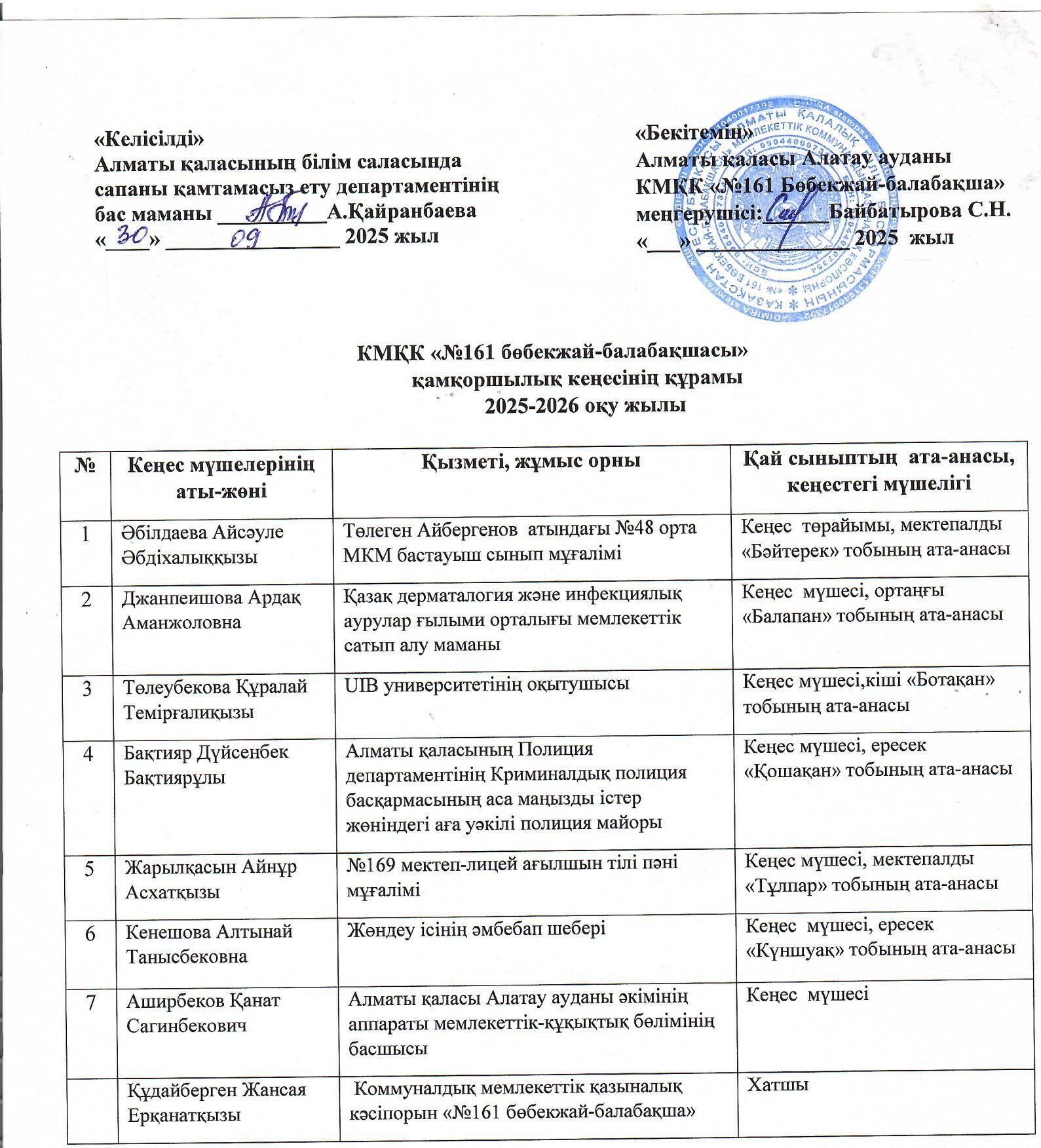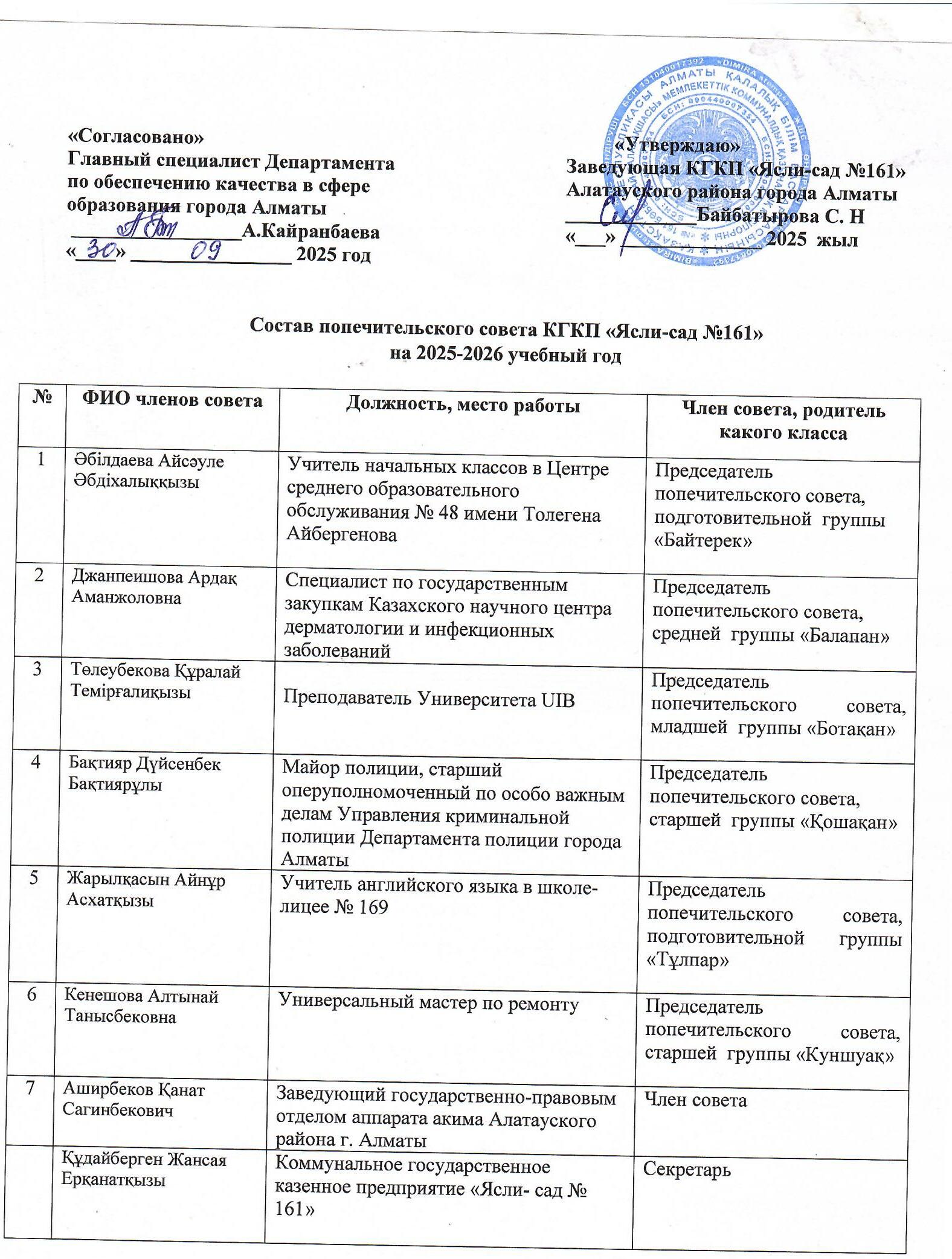 Қамқоршылық кеңес құрамы » ГККП "Ясли-сад №161". Алатауский район